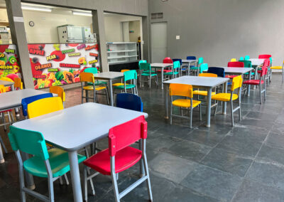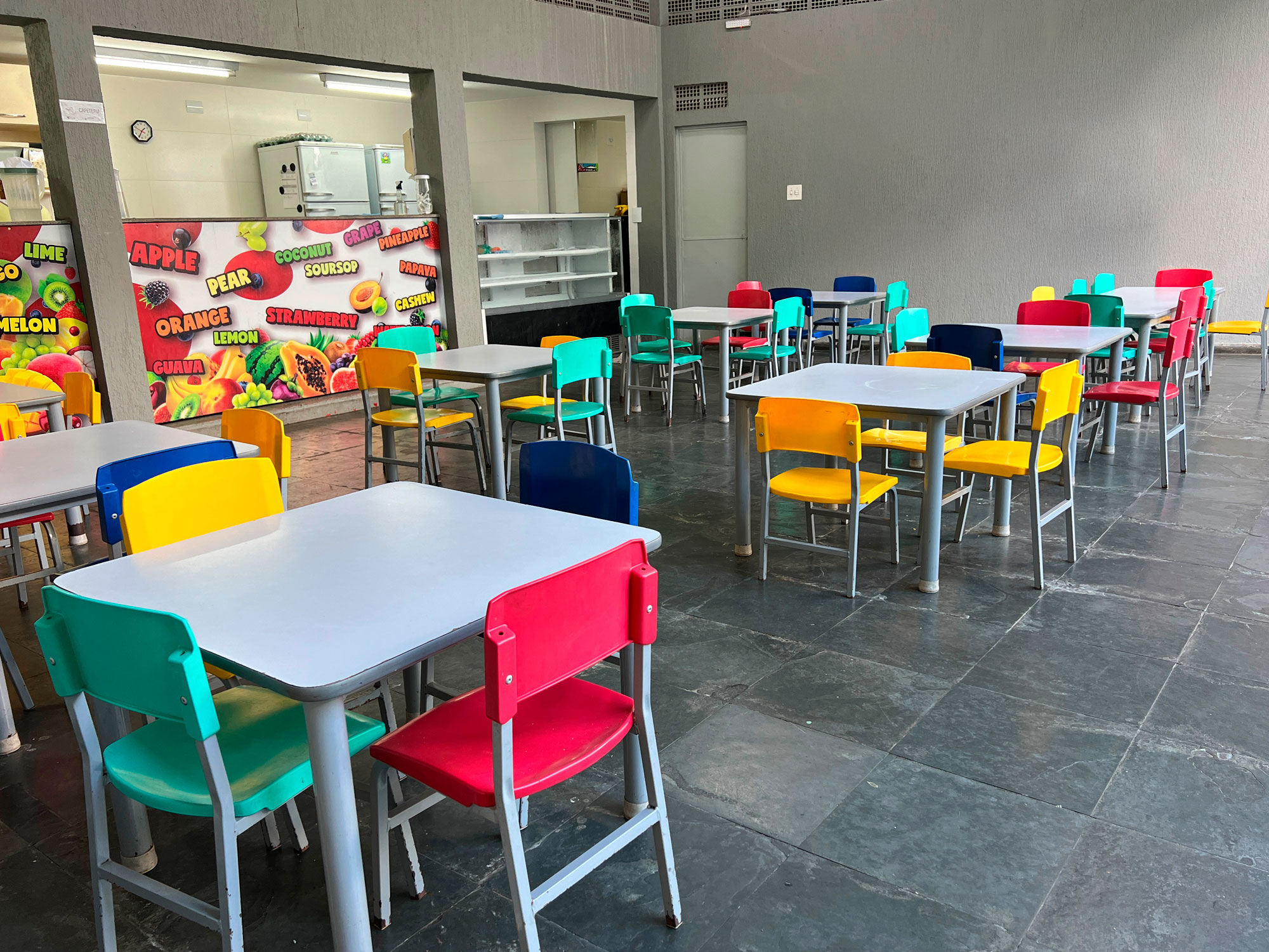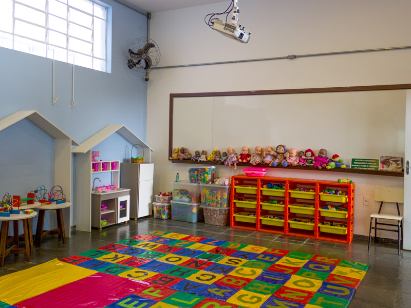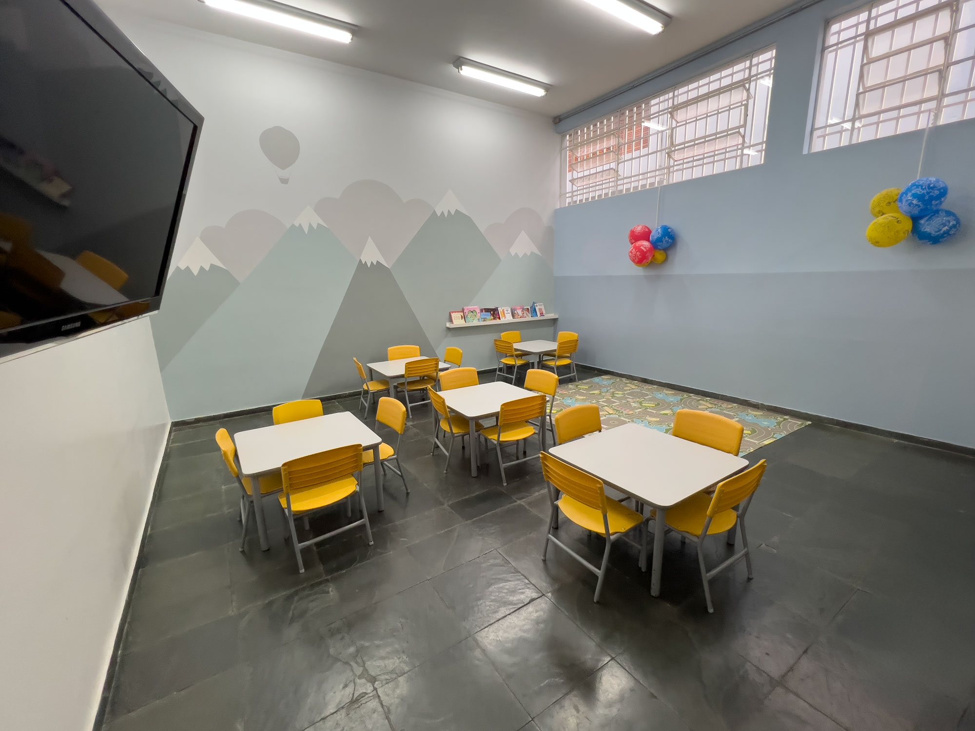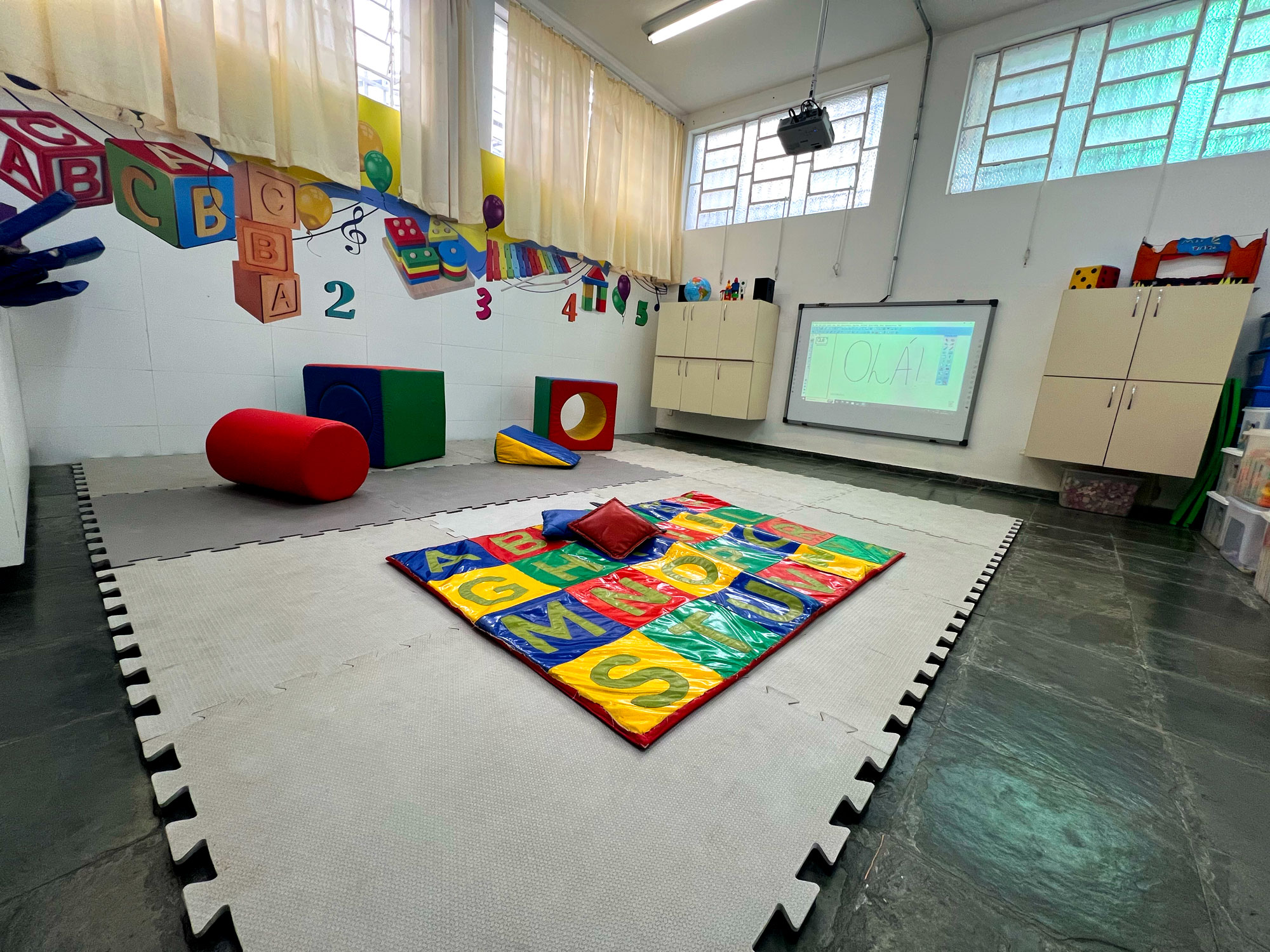 Estrutura pensada para a infância: pátio, salas interativas e refeitório.